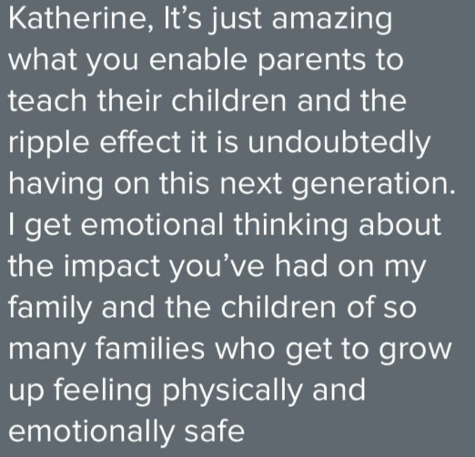 “I didn’t know what to do, other than repeat the things that were done to me, or give in. Katherine’s work has given us other options.” -